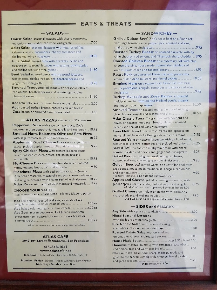 The menu at Atlas Cafe is a delightful combination of artisanal coffee, mouthwatering pizzas, and refreshing non-alcoholic beverages. Start your visit with the freshly brewed Las Pilas Espresso or indulge in the Grand Coffee Lights On Drip; each sip is a testament to their commitment to quality. If you’re in the mood for something savory, don’t miss out on the Pineapple Pepperoni Pizza*, where the sweetness of pineapple beautifully complements the rich, savory flavors of pepperoni. Alternatively, the Apples And Goat Cheese Pizza provides a unique twist that melds crisp apples with creamy goat cheese for a memorable taste experience.